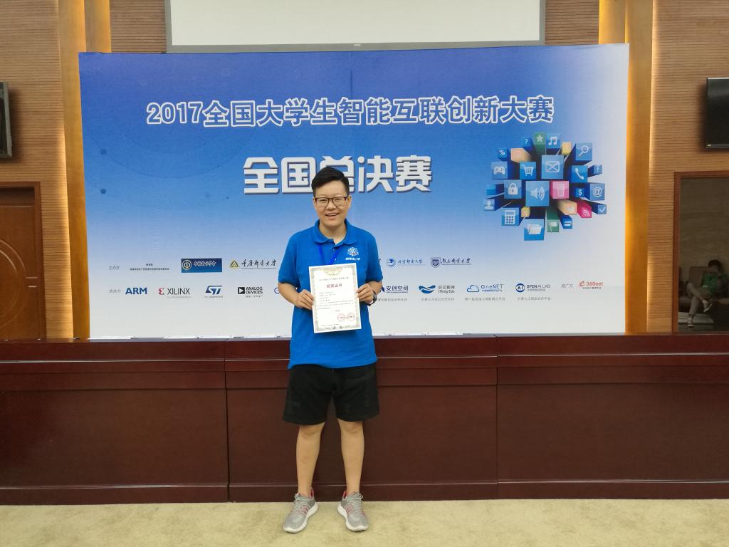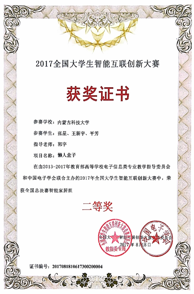 2017年8月17日至19日,由教育部高等m88官网电子信息类专业教学指导委员会和中国电子学会联合主办第二届“全国大员工智能互联创新大赛”全国总决赛在重庆邮电大学举行。来自包括我校、哈尔滨工业大学、电子科技大学、北京邮电大学等近200所高校的967支队伍参加比赛。m88官网员工张星、平芳与机械工程公司员工王新宇共同完成的项目“懒人盒子”在本次大赛中获全国二等奖。同时,m88官网臧琛瀚、刘存凯、翟天坤等同学分别完成的三个项目获得华北赛区二等奖,颜蒙蒙等同学完成的两个项目获得华北赛区三等奖。