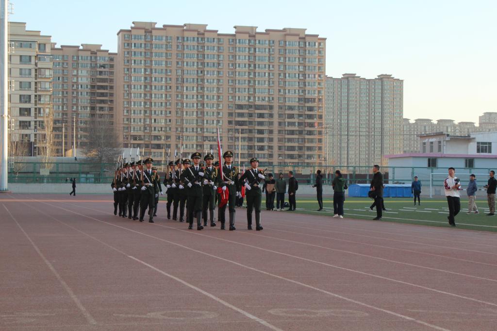 升旗仪式于7点正式开始。在全体师生的注目礼下,英姿飒爽的国旗护卫队队员们护送鲜艳的五星红旗进场,行礼完毕,伴随着庄严的《中华人民共和国国歌》,五星红旗冉冉升起,迎风飘扬。在场的每一个人面向国旗行注目礼,深怀对祖国无限的热爱和崇高的敬意。
